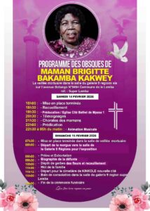 Dimanche 15 février 2026, la levée du corps se fera à la morgue Bolila de Ngaba. Dans un élan de respect et de profonde affection, la dépouille de Maman Brigitte sera conduite vers la Salle Galerie 9 Régions pour l’exposition et les cérémonies funéraires. Ce moment permettra à chacun d’offrir un dernier regard, une dernière prière, un dernier adieu empreint de lumière et de gratitude.