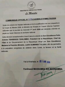 Consulté par notre rédaction, un communiqué officiel du Ministère de l’Emploi et du Travail annonce une journée chômée et payée sur toute l’étendue de la RDC, consécutive à la qualification des Léopards pour la Coupe du monde 2026. Entre célébration sportive, geste d’État et doute lié à la date du 1er avril, le texte ouvre une lecture où la joie nationale devient instrument politique et récit collectif.