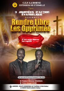 Dans un monde marqué par les incertitudes, les luttes intérieures et la quête profonde de sens, une voix s’élève pour appeler à la liberté, à la restauration et à l’espérance. Le Centre Évangélique Francophone Vie Éternelle Extension de la Borne, vous convie à trois soirées exceptionnelles d’action évangélique, placées sous le signe de la libération spirituelle :